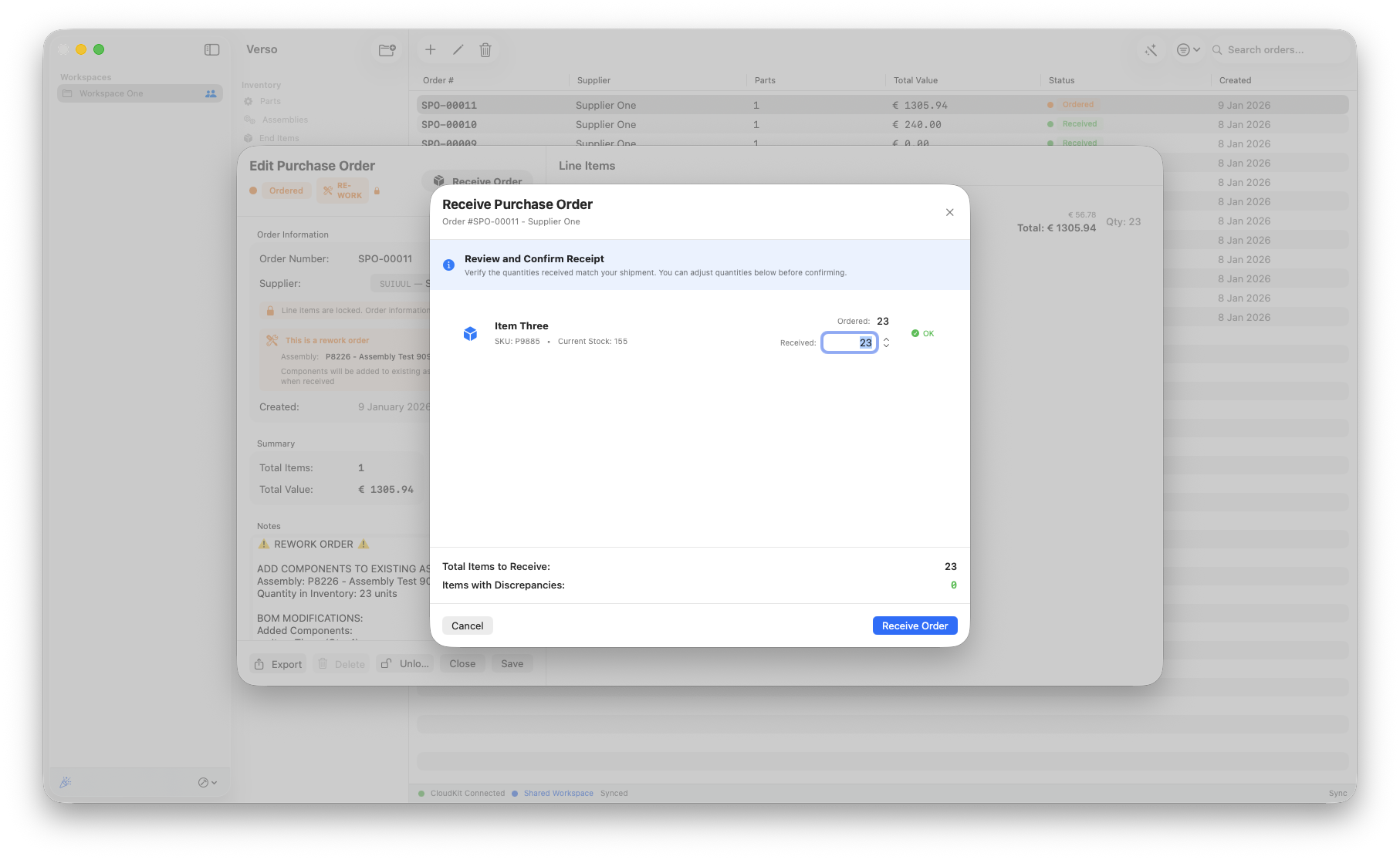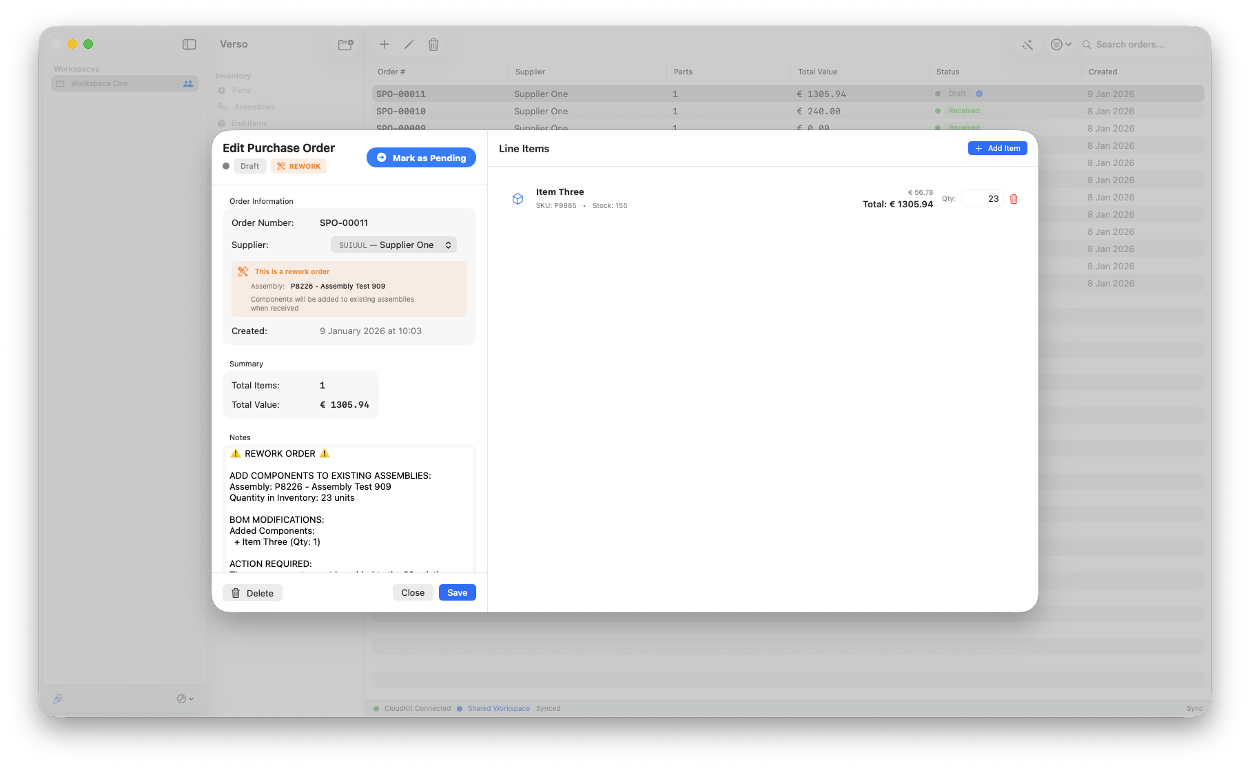 If you chose to rework existing stock We've implemented the proper steps to change your BOM properly and keep track of your inventory. This workflow only works if the part that is being added to your assembly is on stock for the proper quantities. This workflow uses the purchase order to create a rework.